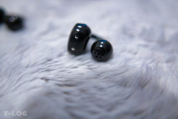 スピーカー部分のアップ。細かい穴が開いた造形は、音の広がりを演出するための設計でしょう。12mmダイナミックドライバーからの音が、どのように耳に届くのか期待が高まります。